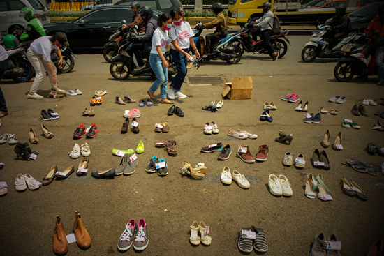 11月25日,印度尼西亚雅加达,摆放在国会大厦前的象征反对性暴力的鞋子。11 月 25 日是国际消除对妇女暴力日,近日,人们在印度尼西亚雅加达的国会大厦前举行反对性暴力的活动。维里/摄(新华社发)