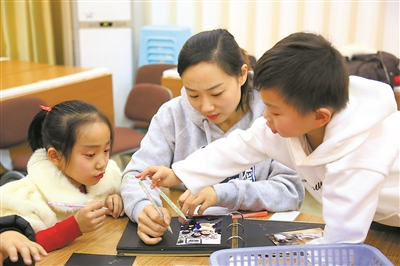 在奇色花福利幼儿园“奇趣童真——亲子嘉年华”活动中,孩子在家长的陪伴下,一起选择在园活动的照片,制作成长相册,回顾幼儿园点滴生活。孙钢军 摄 |
