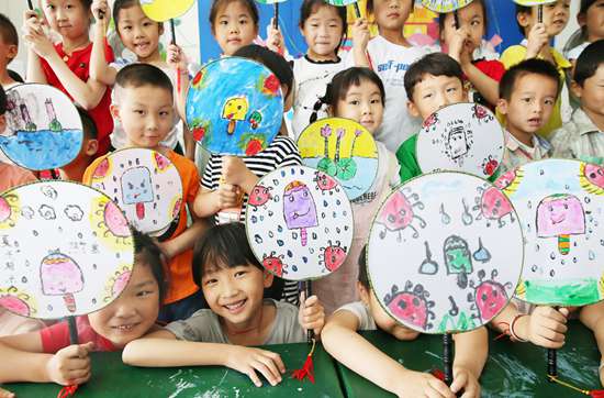 6月20日,江苏省南通市观音山中心幼儿园的小朋友们在展示彩绘团扇作品。