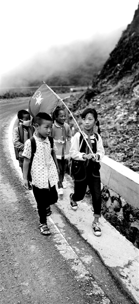 9月3日上午,四川省凉山州金阳县天地坝镇吉史里口村的几名孩子走在上学路上。他们从家到学校需要走大概40分钟,由于上学放学需要经过一段国道主干线,为了保证安全,学校将村里的孩子分成若干个小组,每天由小组长扛着少先队队旗,领着同学一同行动。