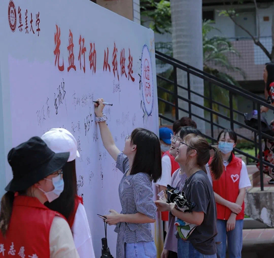 集美大学发起节约倡议,同学们在写着“光盘行动,从我做起”的展板上签下自己的名字。集美大学供图