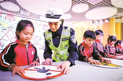 3月29日,在浙江省长兴县龙山街道中心幼儿园,民警和孩子们一起进行交通标识拼图游戏。当日是第26个全国中小学生安全教育日,长兴县龙山街道中心幼儿园联合长兴县公安局交通管理中心开展“交通安全课进校园”活动。