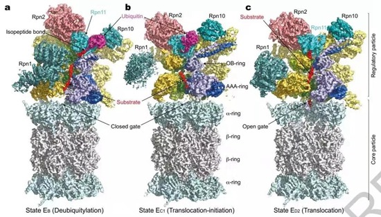 而该论文通过冷冻电子显微镜和机器学习技术的结合,解析了人源蛋白酶体26S在降解底物过程中的7种中间态构象的高分辨(2.8~3.6埃)精细原子结构,最好局部分辨率达2.5埃。