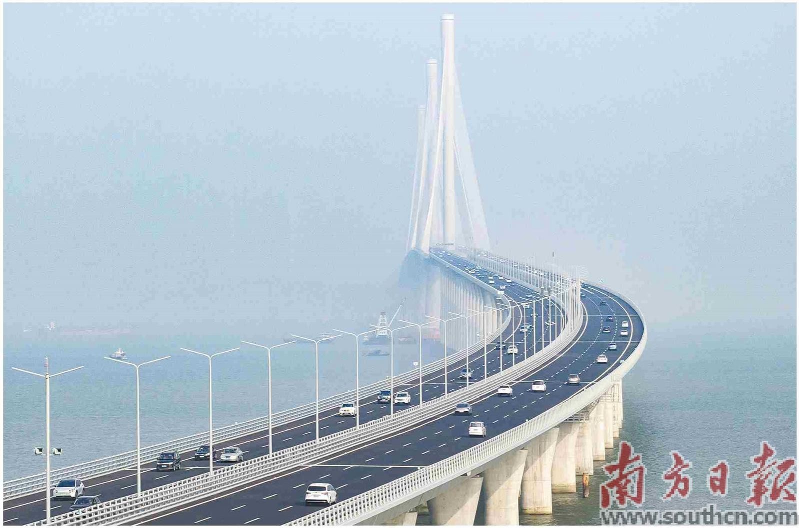 12月11日下午3时,随着现场指示灯由红变绿,排在闸道口首位的大巴缓缓通过高栏港收费站,粤港澳大湾区第三个国家级跨海通道项目——黄茅海跨海通道正式开通试运营。这座“海上长虹”亮相于庆祝澳门回归祖国25周年之际,以独特的姿态闪耀在珠江之畔。