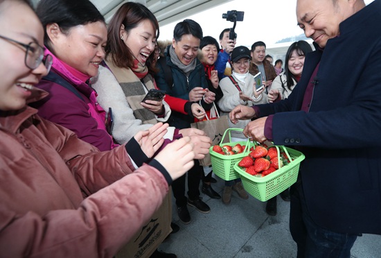 12月25日,首批乘坐杭黄高铁抵达建德站的游客,下车后品尝到了建德“全民导游”代表送上的新鲜草莓。当日,杭州至黄山高铁正式开通运营,从杭州至下辖建德市的最快车程缩短至约50分钟。建德当地采摘游、乡村游等农业观光项目吸引了沿线游客。