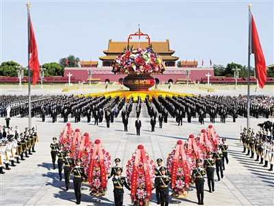 方阵前,以中共中央,全国人大常委会,国务院,全国政协,中央军委,各民主党派、全国工商联和无党派爱国人士,各人民团体和各界群众,老战士、老同志和烈士亲属,中国少年先锋队名义敬献的9个大型花篮一字排开,花篮红色缎带上书写的“人民英雄永垂不朽”格外醒目。