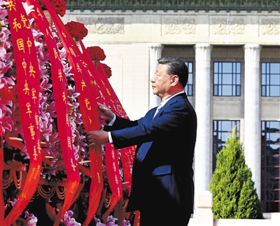 习近平迈步上前,仔细整理花篮缎带。随后,习近平等党和国家领导人缓步绕行,瞻仰人民英雄纪念碑。