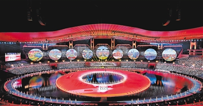 以《圆梦未来》为主题的文体展演拉开序幕。整个演出由“同根同源”“同心同缘”“同梦同圆”3个篇章组成,创新运用体育元素、艺术手段和前沿科技,生动诠释了本届全运会“激情全运会,活力大湾区”的主题。