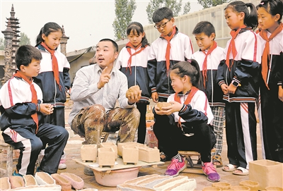 ▲5月17日,山东省枣庄市齐村砂陶博物馆,小学生在聆听山东省级非物质文化遗产齐村砂陶第六代传承人项彪(左三)讲解齐村砂陶的制作技艺。吉喆 李群 摄