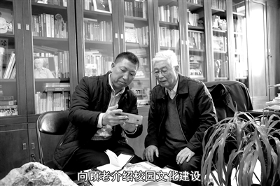 向顾明远先生(右)展示学校文化建设照片。本文作者 供图