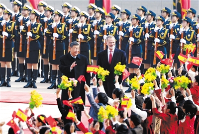 习近平欢迎费利佩六世国王访华,指出中国和西班牙都有深厚的历史文化底蕴。建交50多年来,两国坚持从战略高度和长远角度看待和发展双边关系,相互尊重、相互支持、相互成就,树立了不同历史文化、不同社会制度国家友好相处、共谋发展的典范,也为推动全球开放合作、维护国际公平正义发挥了重要作用。西班牙王室为中西关系发展作出了突出贡献。在两国迎来建立全面战略伙伴关系20周年之际,费利佩六世国王对中国进行国事访问,对推动两国友好合作不断向前发展具有重要意义。