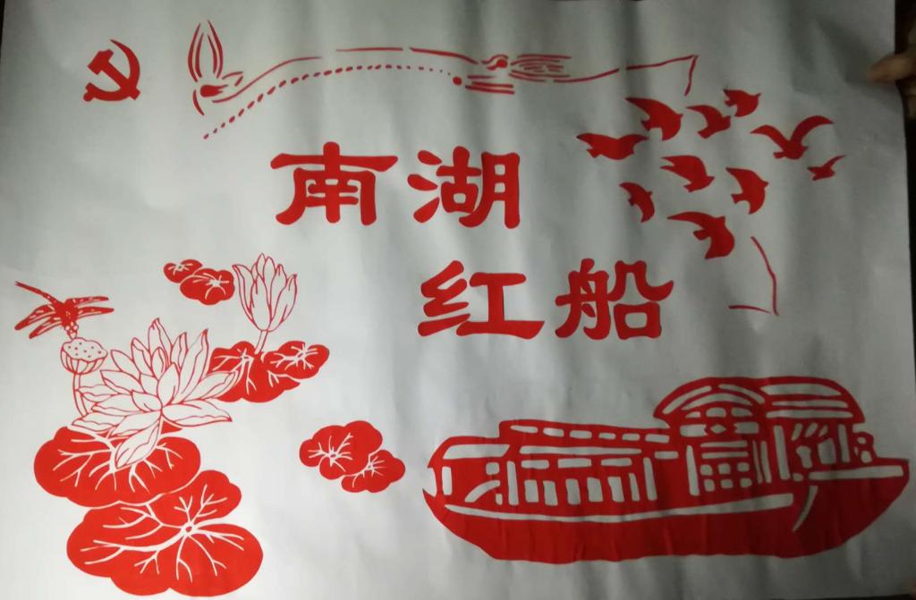 《南湖红船》是由岭南师范学院流芳文化团高级剪纸班的李舒慧同学的第一次创造,讲述的是1921年中国共产党第一次全国代表大会在浙江嘉兴南湖胜利闭幕的故事。党徽与船只、莲花的结合表明了这次会议的特殊性是在湖面船只上展开的,而展翅高飞的和平鸽则象征了这次会议在中国历史上的领导性意义,简单事物的结合为我们传达了开天辟地和敢为人先的首创精神,李舒慧同学选材的精辟与画面的完美刻画也值得我们学习。