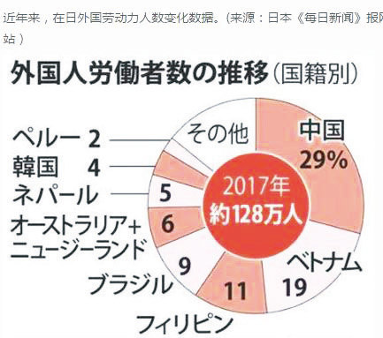 在日外国劳动人口变化数据(按国别分)2017年在日外籍劳动人口约为128万人,其中中国人占29%,越南19%,菲律宾11%,巴西9%,澳大利亚和新西兰6%,尼泊尔5%,韩国4%,秘鲁2%,其他约为15%。来源 日本《每日新闻》报网站