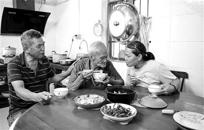 临近午饭,用餐时,老人端起一碗粥,吃得畅快利落。饭桌上摆着丝瓜炒肉、空心菜、鱼干煲肉片,儿子肖境贵不时为他夹菜,画面温馨感人。
