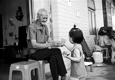 “父亲又想出去找乐子了,想去看村民打山棋、牌九,好不容易才劝住他,说记者要来采访,先等等再去。”儿媳妇陈建玲见到记者到来,热情地介绍道,随后端出切好的西瓜,泡上热茶。一旁2岁多的曾孙女,捧着西瓜,跌跌撞撞跑向老人,奶声奶气地喊着:“佬佬,吃西瓜!”老人布满皱纹的脸庞瞬间绽放出灿烂笑容,温馨场景看得人心里暖意融融。