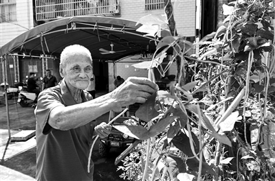 5月21日,记者一行驱车前往廉江市良垌镇崇山村三队。尚未下车,便瞧见百岁老人肖保春在门前椅子上小憩,其身后种植着鱼腥草、豆叶、玫瑰花等植物,一片绿意盎然。
