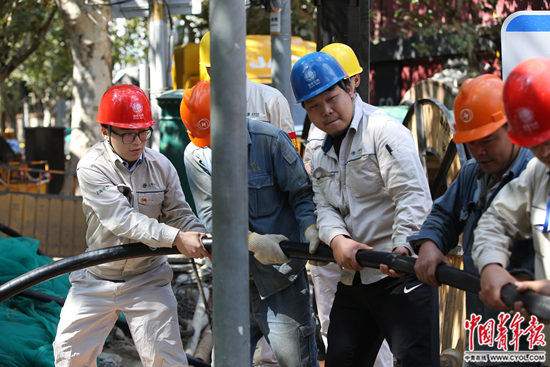 10月12日,上海一处街道,国网上海公司的青年突击队员们在进行架空线落地工程施工。中国青年报·中青在线记者 陈剑/摄