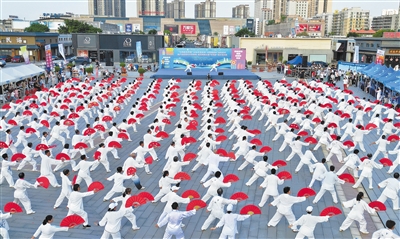 8月8日下午,太极功夫扇联合表演队在2025年湛江市“全民健身日”启动仪式上表演。 本报记者刘冀城 摄