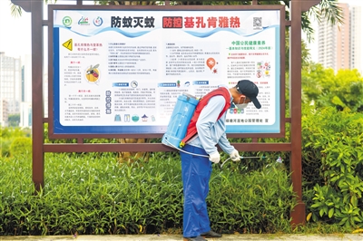 银帆公园内,工作人员在防蚊灭蚊宣传栏前喷洒灭蚊剂。 本报记者郎树臣 摄
