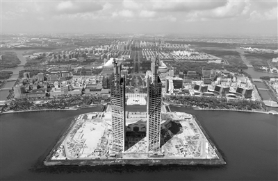 9月6日拍摄的临港西岛中银金融中心项目建设工地(无人机照片)。当日,位于中国(上海)自由贸易试验区临港新片区的中建二局临港西岛中银金融中心南北双塔核心筒完成封顶,高度195米的两座主楼核心筒工程完成施工。临港西岛中银金融中心项目总建筑面积28.25万平方米,建筑主体为南北两座高200米的双子塔楼,中心建成后将成为以金融总部办公为主体的大型城市综合体。