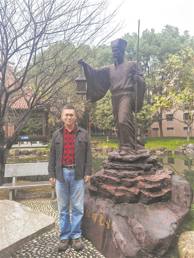 此次赴余姚的目的不是旅游,而是与浙江上百名高中语文教师交流《乡土中国》整本书阅读的。次日早餐后,我赶到余姚中学,在陈智峰和戴柏葱两位老师陪同下,我们来到了阳明雕像前。大概校园中心位置有一个小池,半围着廊亭,通往池心的蜿蜒小径,尽头就是阳明雕像。阳明左手持一根竹杖,右手前倾提着一盏灯笼,照着前方的路,呈迈步前行之姿。我们猜测着竹杖和灯笼的寓意:竹杖是纪念阳明青年时格竹子的故事吧,那么灯笼呢?午饭后,雨已停,阳光若隐若现。我与几位老师来到阳明雕像前合影留念,再谈起阳明的灯笼,记不得谁说的,阳明生活的时代周围非常黑暗,他打着一盏灯笼为人们照明。我则推测这盏灯笼意味着阳明心学思想。