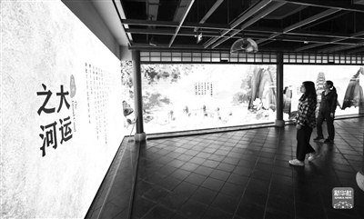 图为游客在观看数字化呈现的大运河相关诗词及景色。 新华