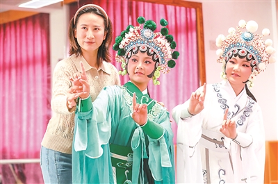 近日,在浙江省湖州市德清县新安镇勾里中心学校,戏曲教师在指导学生练习戏曲。近年来,该校积极开展“戏曲进校园”活动,聘请专业戏曲演员每周固定时间进校传授,让学生近距离感受戏曲文化的魅力,增进对传统国粹的了解和传承。王树成 摄