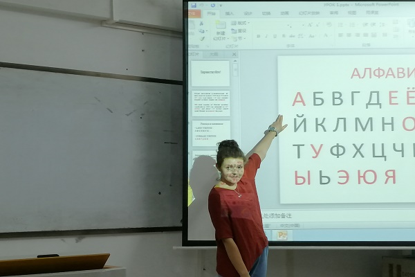 讲座伊始,作为引入,Volha Davydzik老师带领同学们跟读俄语字母表,熟悉各个字母的发音,并教授同学们一些简单句式。接着,Volha Davydzik老师向同学们展示各组俄语字母组合、单词。她先带领同学们跟读字母组合、单词的发音,然后引导同学们学会自己看着单词借助记忆发出准确的读音,并及时纠正,以加深他们对单词的发音的记忆。紧接着,Volha Davydzik老师结合图片为同学们解析各个单词所代表的意思,并带领同学们跟读含有相关单词的简单句式,反复练习,使他们更好地掌握及运用。在此期间,Volha Davydzik老师为了让同学们更准确地掌握各种俄语单词的发音,在倾听在场每一位同学的发音后,会适时予以鼓励或提出建议。经过三轮学习后,同学们对俄语单词的发音有了一定程度的掌握。随后,Volha Davydzik老师向同学们展示四张图片,引导他们使用刚刚学过的句子看图提问,以巩固知识。最后,Volha Davydzik老师带领同学们简单认识一些日常用语和单词。讲座在同学们的掌声中结束。