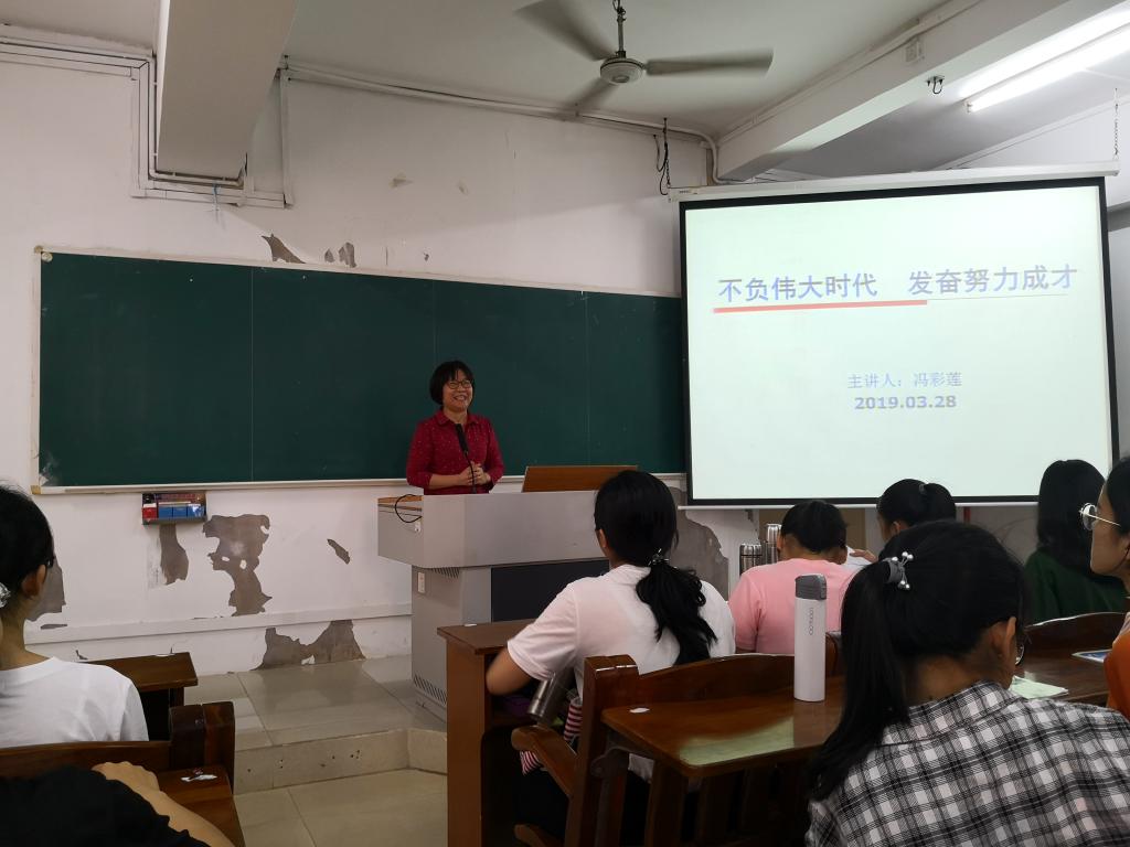 2019年3月28日和4月2日,党委冯彩莲书记和主持学院行政全面工作的杨红副院长分别给2018级部分学生讲授了主题为《不负伟大时代,发奋努力成才》和《落实立德树人根本任务,争做新时代大学生》的思想政治理论课。