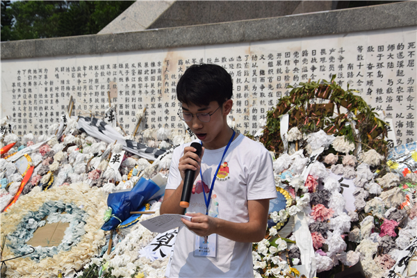 其次,由团委副秘书长吕啟发致哀悼词。尽管烈士们虽已逝去,但他们奋勇拼搏的精神,时刻提醒着我们铭记历史,勉励着我们刻苦用功,激励着我们贡献祖国!随后,在主持人的带领下,大家进行了一分钟的默哀。“桃花红雨英雄血,碧海丹霞志士心。今日神州看奋起,陵园千古慰忠魂!”在这短暂又漫长的一分钟里,大家缅怀着英勇的先烈们,对他们致以崇高的敬意。