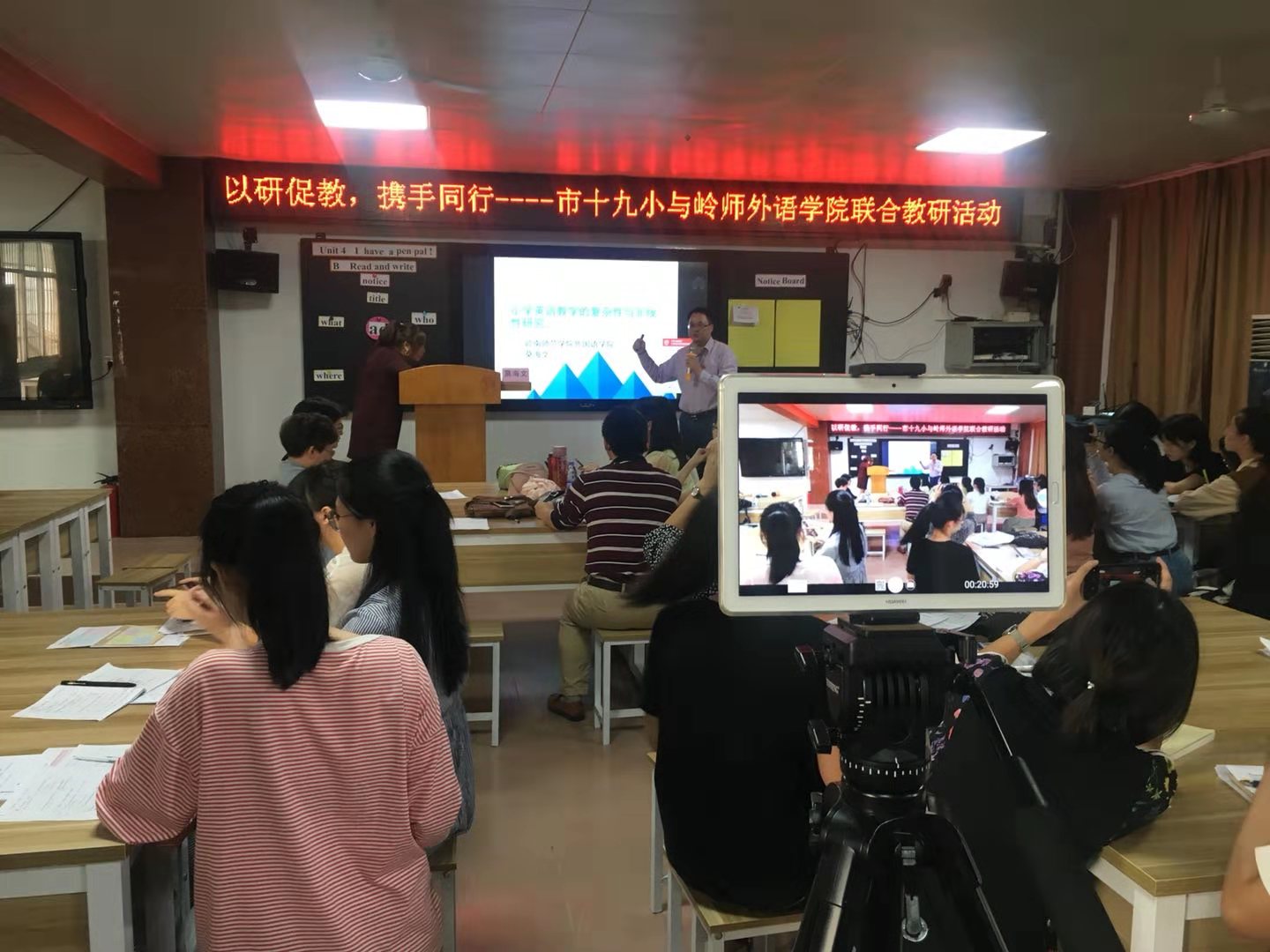 11月4日下午,为了走进基层教育,促进英语系教研教学水平的提升,在外国语学院莫海文副院长带领下,英语系师生来到湛江市十九小,依托“梁秋真”名教师工作室,进行了一次全市直播的教学研讨会。