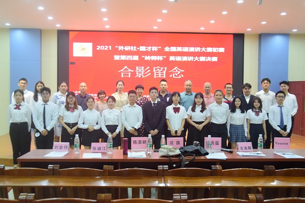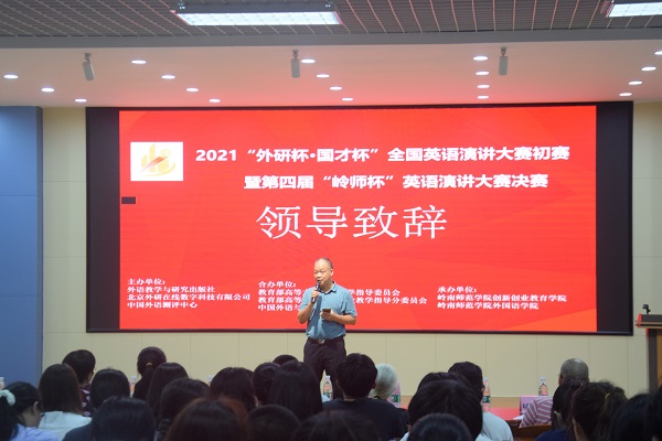 10月10日晚,外国语学院在教三511教室举办了2021“外研社杯”全国英语大赛初赛暨第四届“岭师杯”英语演讲大赛。出席本次大赛的嘉宾有:外国语学院党委书记陈永国和杨建伟副书记、创新创业教育学院刘金祥教授和教学部张迪江主任、外国语学院周扬副院长和陈湛妍副院长、英语系主任古永辉、商务英语系余炎燊老师以及外籍教师Yvonne。