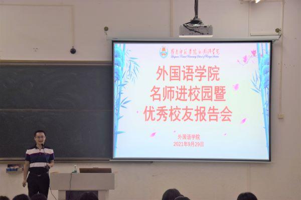 9月29日晚,外国语学院在教三611教室举行优秀校友报告会。主讲嘉宾是来自岭南师范学院附中的中共党员、高中英语高级教师兼广东省英语骨干教师黄美娜老师。黄老师是外国语学院2001级校友,现为高中英语备课组长、教研带头人。