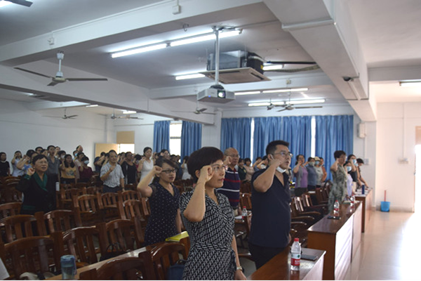 为进一步加强教师师德建设,切实增强教师教书育人的责任感、使命感和荣誉感,学院党委组织全体教师宣誓。教师们举起右拳,庄严宣誓:我是一名光荣的人民教师,我庄严宣誓:忠诚党的教育事业,贯彻党的教育方针,遵守教育法律法规,履行立德树人职责。依法治教,教书育人;追求真理,崇尚科学。勤勉敬业,严谨治学;因材施教,注重实践。热爱学生,为人师表;师生平等,教学相长。廉洁从教,乐于奉献;终身学习,勇于创新。做学生良师益友,铸教师高尚人格。为人类社会的文明进步,为人民的教育事业奋斗终身。