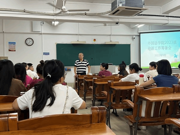 9月6日晚,外国语学院2023级迎新工作筹备会在教三405召开,会议由学院党委副书记杨建伟主持。学工办辅导员、2023级助理班主任及迎新工作人员参加会议。