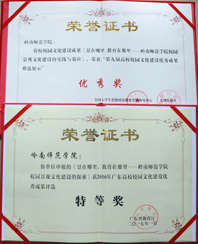 岭师新闻中心讯:近日,学校党委宣传部接到全国第九届高校校园文化建设优秀成果评选获奖证书,由我校申报的《景在哪里 教育在那里——岭南师范学院校园景观文化建设探索》在评选中获得了优秀奖,成为我校第5项全国高校校园文化建设优秀成果奖。