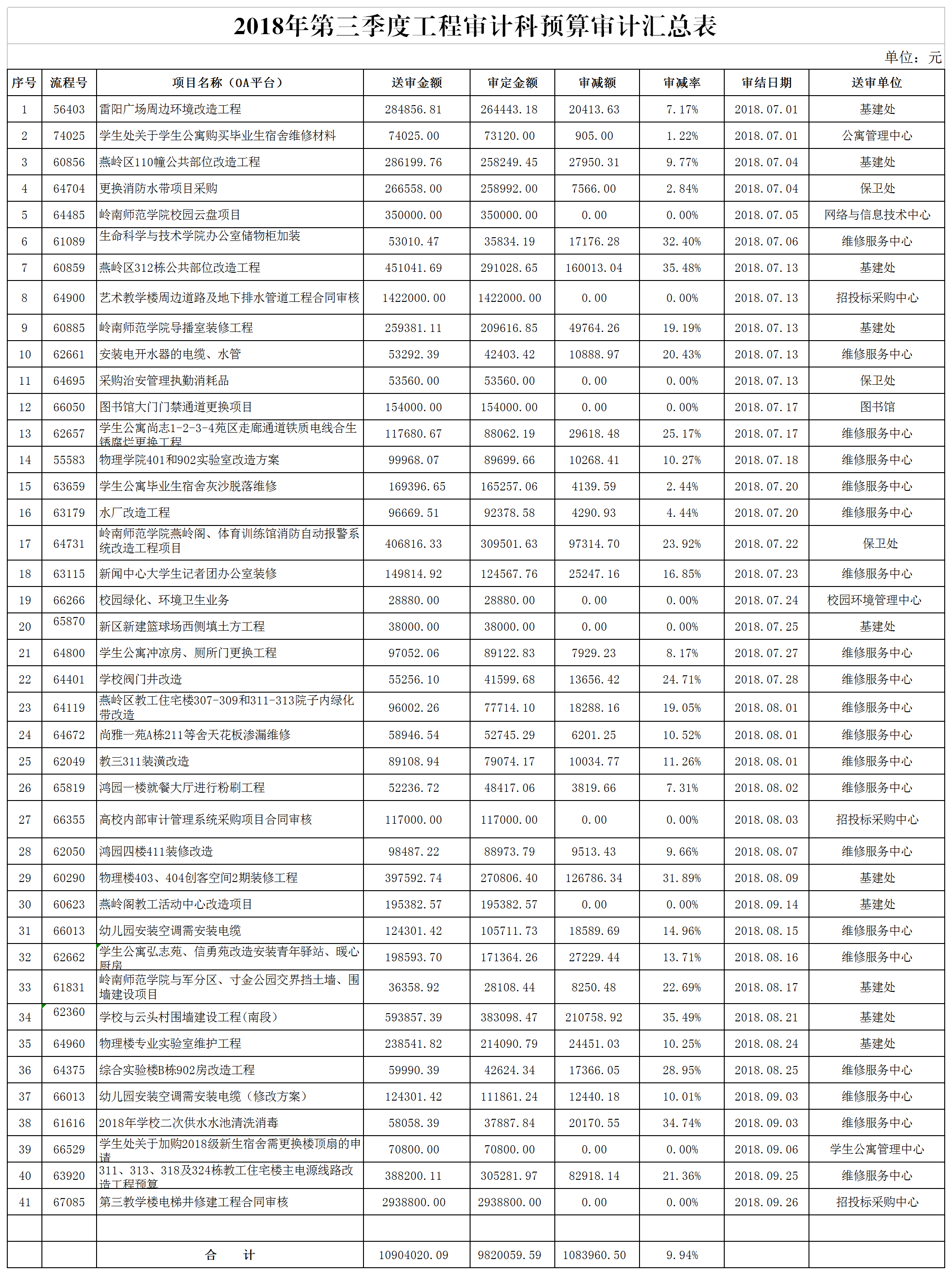 2018年第三季度工程审计科预算审计汇总表