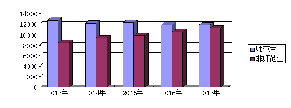 截止到2017年9月10日,全日制在校生总数23030人,师范生11806人,非师范生11224人。近5年,非师范生人数呈逐年增长趋势,但师范生总数仍高于非师范生总数。详见图2——近5年全日制在校生人数比例情况。