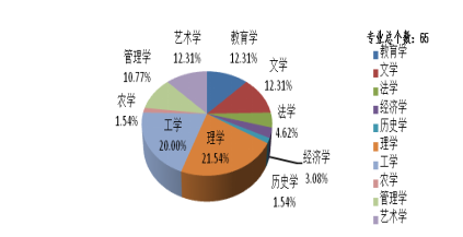 学校设有65个本科专业,其中师范专业33个、非师范专业32个。师范专业中有28个普通师范专业,5个职业教育师范专业。专业设置涵盖教育学、文学、法学、经济学、历史学、理学、工学、农学、管理学和艺术学等10个学科门类。详见表1—本科专业汇总表和图1—学校学科专业门类分布情况。