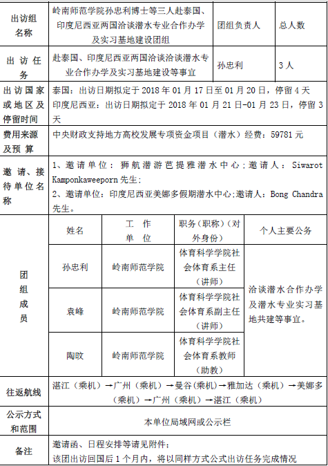 根据省市有关因公出国(境)管理的规定,现将该团组出访相关内容和参团人员名单予以公示。公示时间为2017年12月25日至12月29日(5个工作日)。如有不同意见,请在公示期内,向学校纪委(电话:0759-3182831)和国交处(3183217)反映。