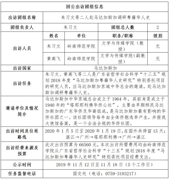 朱习文等二人赴马达加斯加调研出国前信息公示