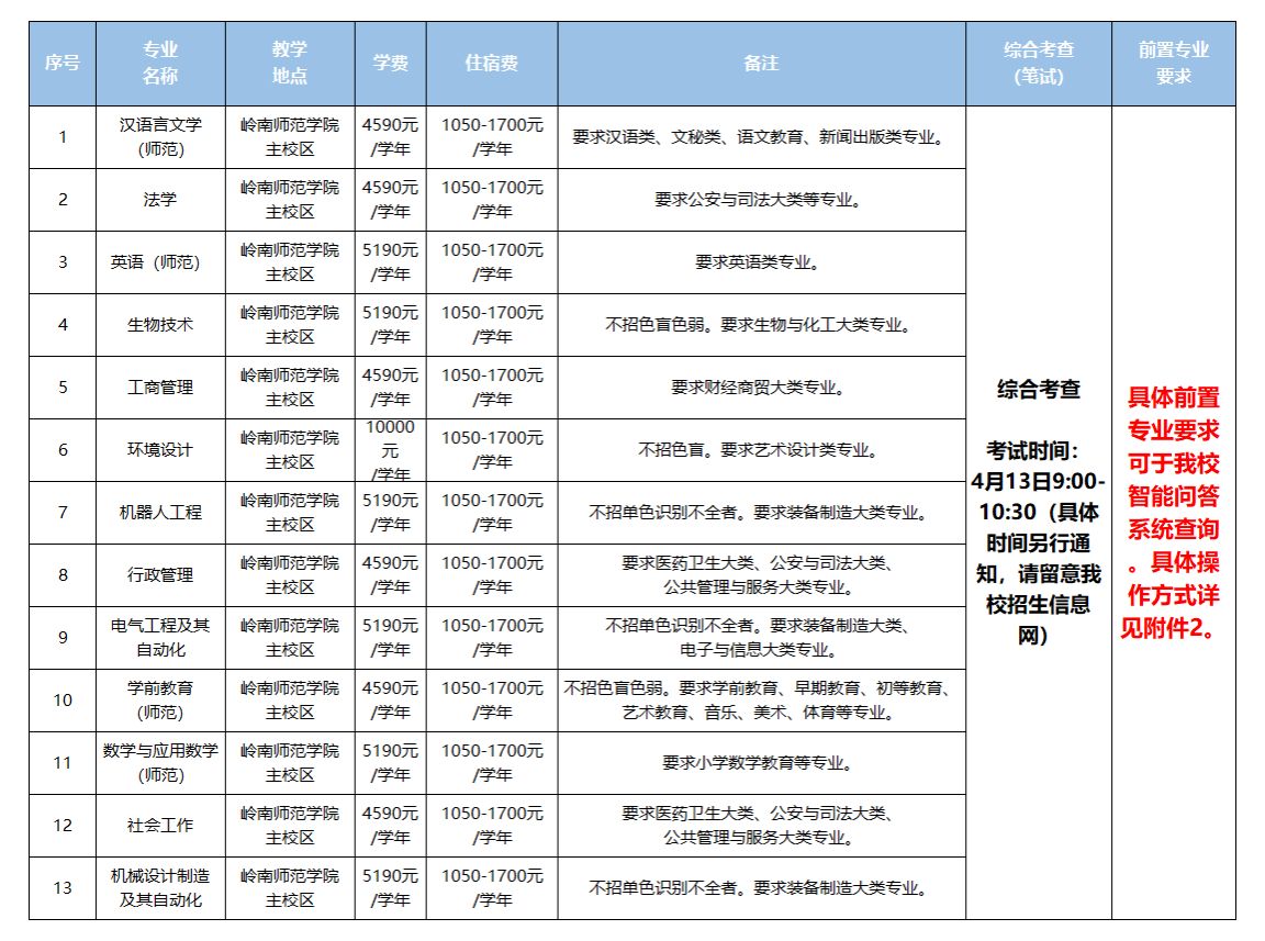 符合退役大学生士兵报名资格的考生免文化课考试。但需参加我校自行组织的综合考查笔试考试,考试时间为4月13日9:00-10:30,考试地点为岭南师范学院(地址:广东省湛江市赤坎区寸金路29号)。《综合考查》考试大纲详见附件3。