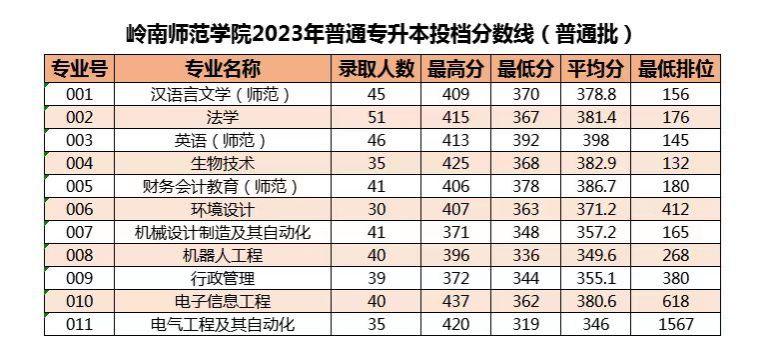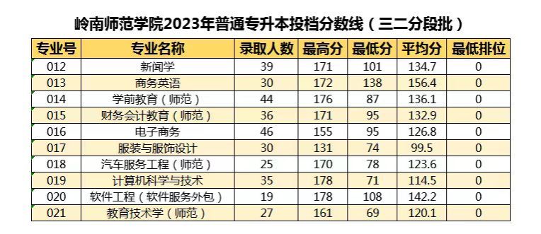 我校2023年普通高等学校专升本招生考试录取工作进展顺利。5月6日,广东省招生委员会根据各科类划定录取最低控制分数线。5月22日,广东省招生办公室按学校各专业招生计划1:1投档,我校退役士兵批次投档30人,录取30人,普通批投档443人,录取443人,三二分段批投档331人,录取331人。最终录取以广东省招生办公室公布数据为准。