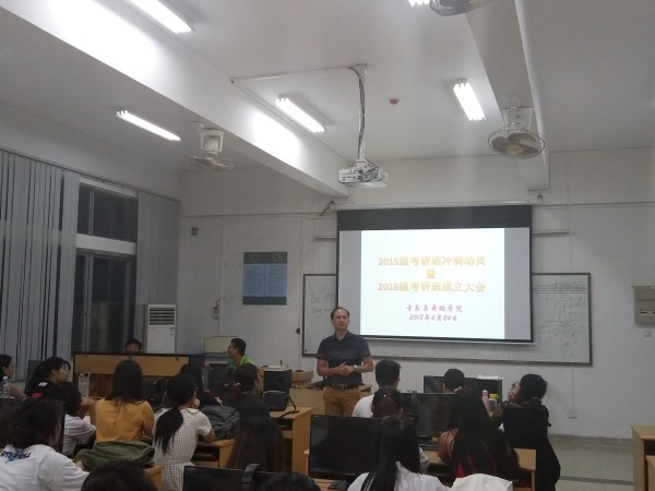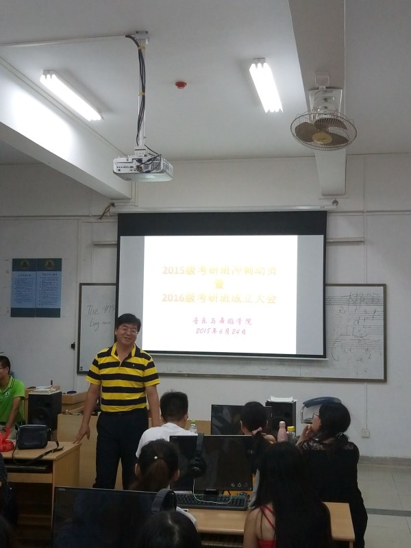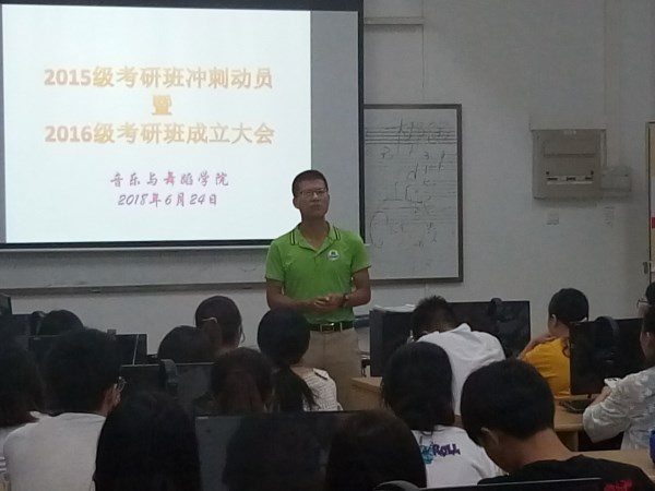 6月24日晚,学校综合实验楼b幢201灯火通明,音乐与舞蹈学院2015级考研班冲刺动员暨2016级考研班成交大会正式开始。孙建华院长、党委王雄艺副书记、朱培科副院长,考研班班主任张力副教授以及15、16级近70名考研学生参加了会议。会议由王雄艺主持。