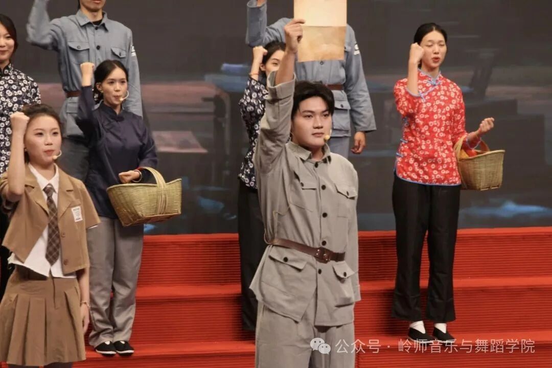 党课以抗战经典音乐与原创片段为脉络,构建跨越时空的情感桥梁。从《松花江上》的悲怆旋律唤起家国沦丧之痛,到《保卫黄河》的磅礴气势激荡民族抗争豪情,再到原创音乐剧《南泥湾的星火》展现自力更生、艰苦奋斗的壮丽史诗,一段段动人乐章配合舞台叙事与历史影像,生动再现了血火交织的岁月与献身民族解放的青春担当。党课尾声,师生原创歌曲《我们是共产主义接班人》将青春誓言化作时代强音,完成一场跨越时空的信仰接力。独特的“时空对话”形式,让历史人物与当代青年在精神层面产生深刻共鸣。