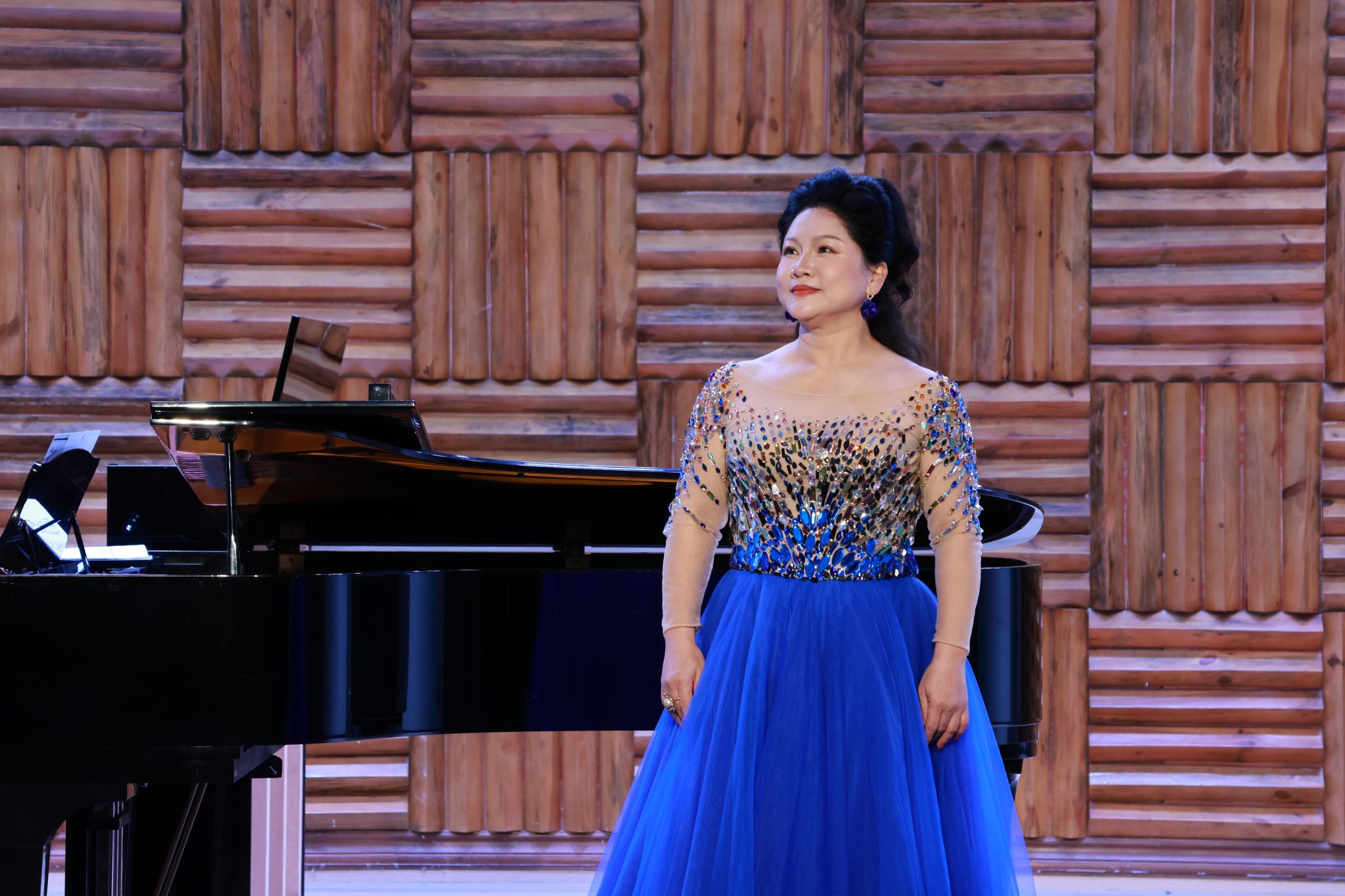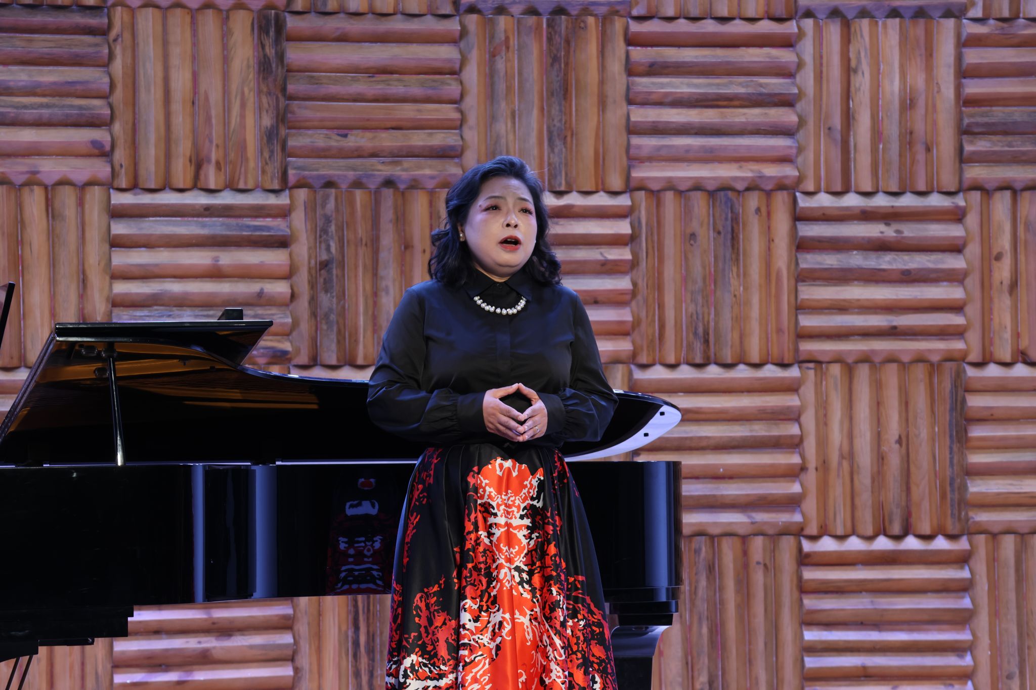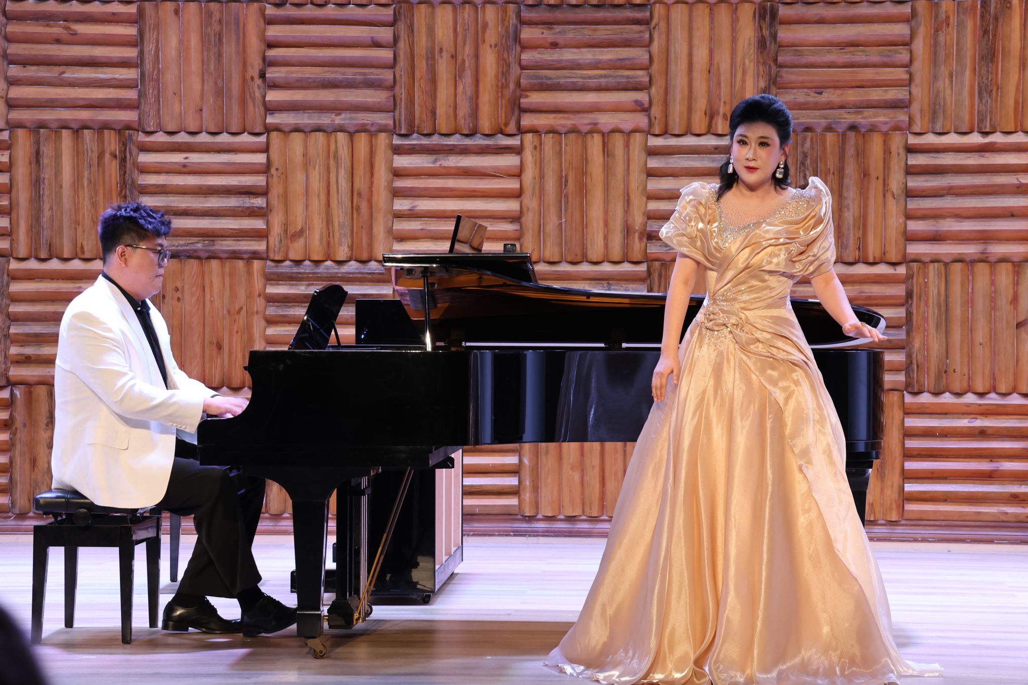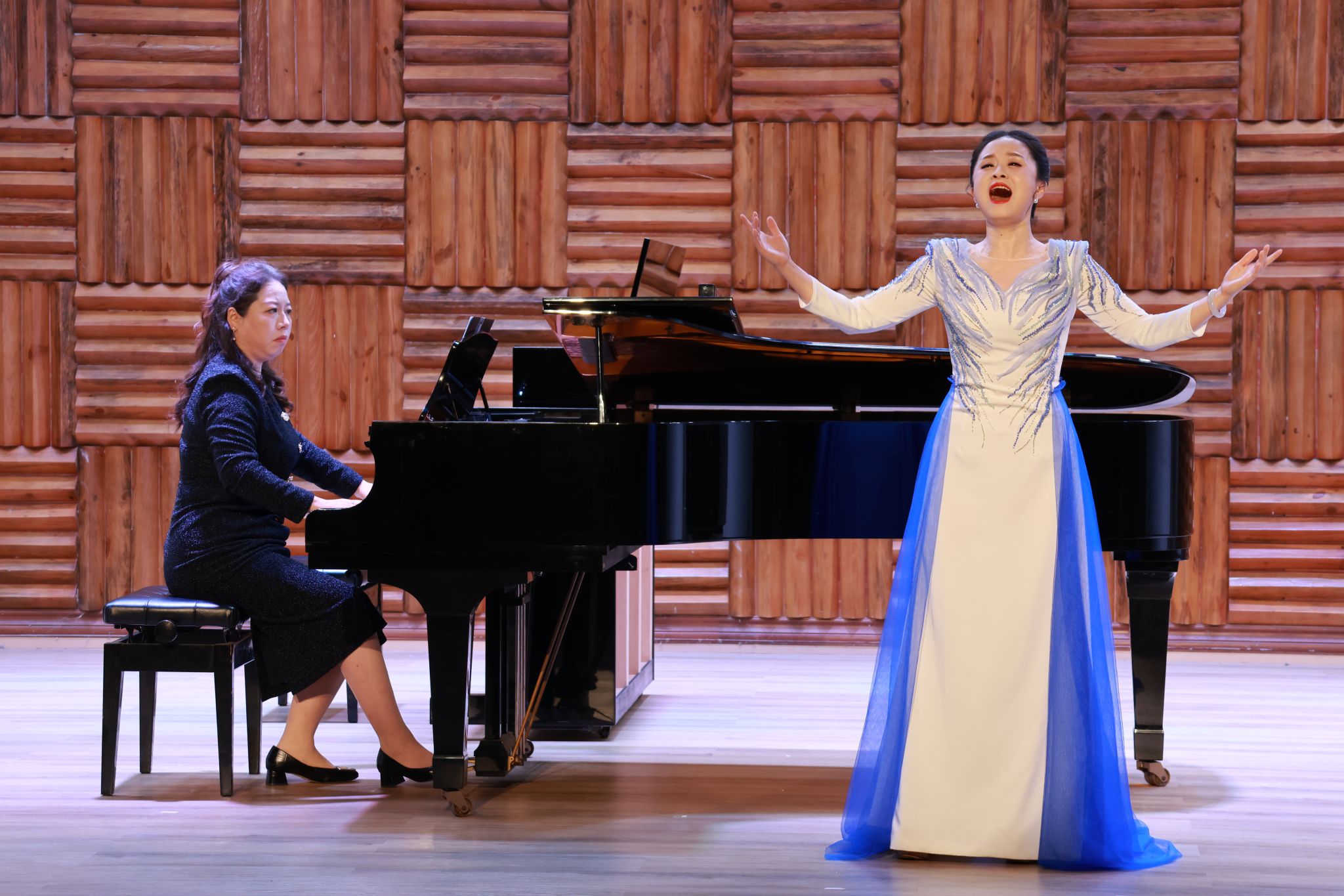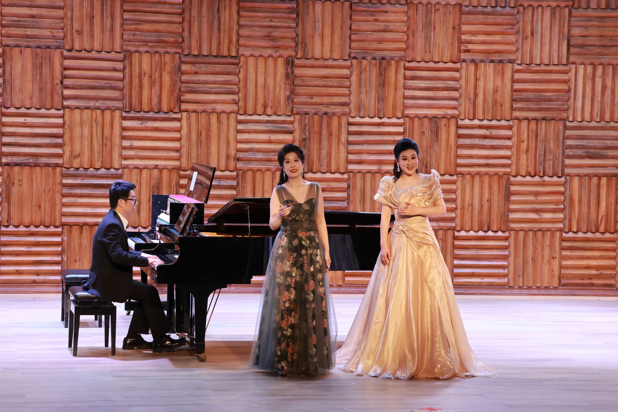 民族与经典碰撞,传统与现代交融。姜会敏演唱的《眷恋》,以明朗旋律赞颂祖国深情,宾川、梁尤其演唱的《等着我,亲爱的人》再现沂蒙山军民的凄美爱情,鲁浩、杨振宇演奏双钢琴改编的《梁祝选段》将越剧韵味与西方演奏技法完美融合,薛敏演唱的《莲灯》借林徽因诗作传递生命信念。刘喜梅接连献上《别唱吧,美人》《寻找太阳升起的地方》两首风格迥异的作品,雷济菁与宾川的女声二重唱《梨花又开放》满含乡愁与思念,曾慧君弹奏的钢琴独奏《黄河》第一乐章,以雄浑气势展现中华民族的坚韧豪情,每一首曲目都赢得全场阵阵掌声。