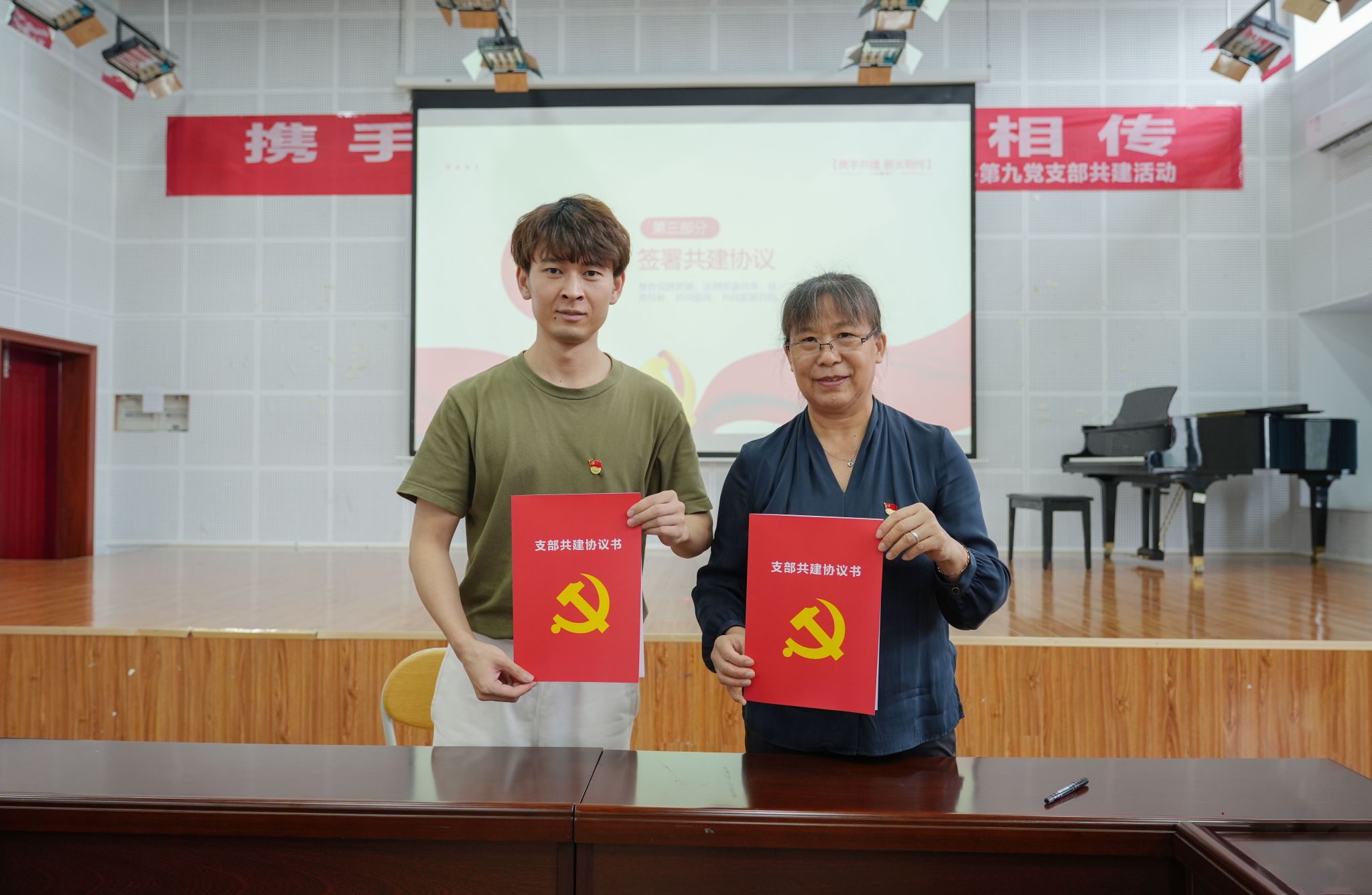 音舞学院教工第二党支部书记李权与离退休人员服务中心第九党支部书记陈春常分别介绍了各自支部的基本情况、党建工作开展情况及特色做法。离退休人员服务中心第九党支部党员杨继焱分享了校园安全方面的工作经验。随后,李权和陈春常代表两个支部签署共建协议,明确共建双方责任、共建意义及共建活动的具体安排,希望以此整合党建资源,达到资源共享、优势互补、共同提高、共同发展的目的。