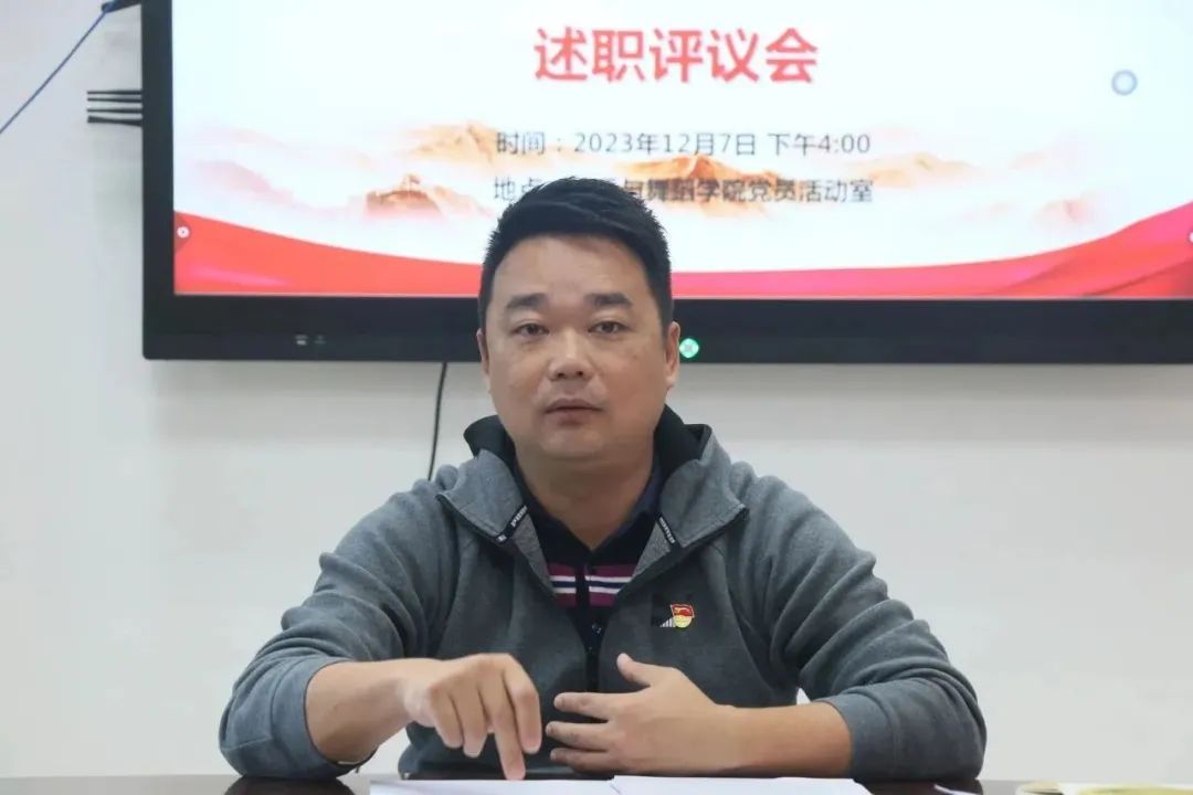 随后,由教工第二党支部书记李权述职,他表示,在2023年的党建工作中,教工第二党支部以习近平新时代中国特色社会主义思想为指导,坚决贯彻立德树人根本任务,努力践行新时代高校党员教师的责任和担当。教工第二党支部以“四强四重”为中心打造“四型”党支部,一是强组织,重制度,打造规范型党支部;二是强素养,重方法,打造学习型党支部;三是强育人,重成效,打造服务型党支部;四是强优势,重品牌,打造创新型党支部。努力提升支部党建质量和水平,奋力走出了一条“党建+育人+创新”的特色之路。