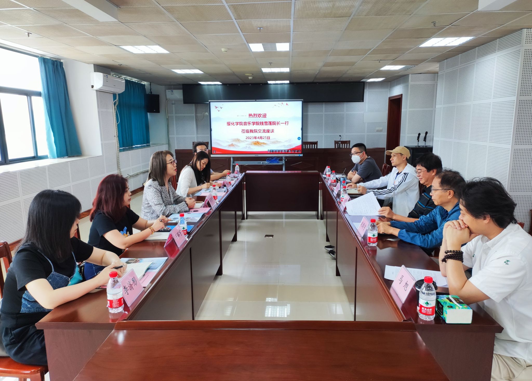 为促进教育资源互补共享,校际合作互动共赢,4月25至26日,音舞学院邀请黑龙江绥化学院到我院开展合作交流。绥化学院音乐学院院长、党总支副书记钱雪莲、舞蹈编导专业负责人李清洁、音乐表演专业负责人王环宇、音乐学(师范)专业负责人李济彤、教学秘书郭大海一行五人到我院开展合作交流。音舞学院院长孙建华、副院长朱培科、刘厚宇、舞蹈系主任冮毅博士、音乐表演系副主任马旭博士、辅导员温霄虎老师参加相关交流活动。