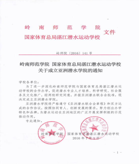 以服务国家海洋战略和全民健身战略需求为导向,以“协同创新”和“协同育人”为根本,2013年岭南师范学院与国家体育总局湛江潜水运动学校联合招收、培养潜水专业学生:2016年7月,双方组建亚洲潜水学院。